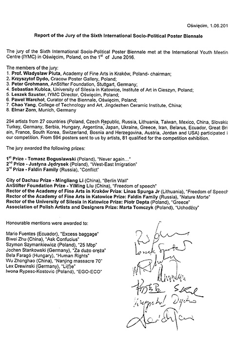 On September 2nd 2016 the Sixth International Socio-Political Poster Biennale was inaugurated at the International Youth Meeting Centre in Oswiecim. Director Leszek Szuster inaugurated the exhibition and welcomed the guest of honor Zofia Posmysz, the artists of the works presented in the Biennale, the delegation from the Consulate of the Federal Republic of Germany in Krakow, representatives from the Austrian Consulate in Krakow, rectors and deans from polish Academies of art, from the local authorities of the city and community of Oswiecim, partners, sponsors as well as a group of apprentices from Volkswagen from Germany and Poland, that were staying at the IYMC for their common seminar "Learning through meeting".